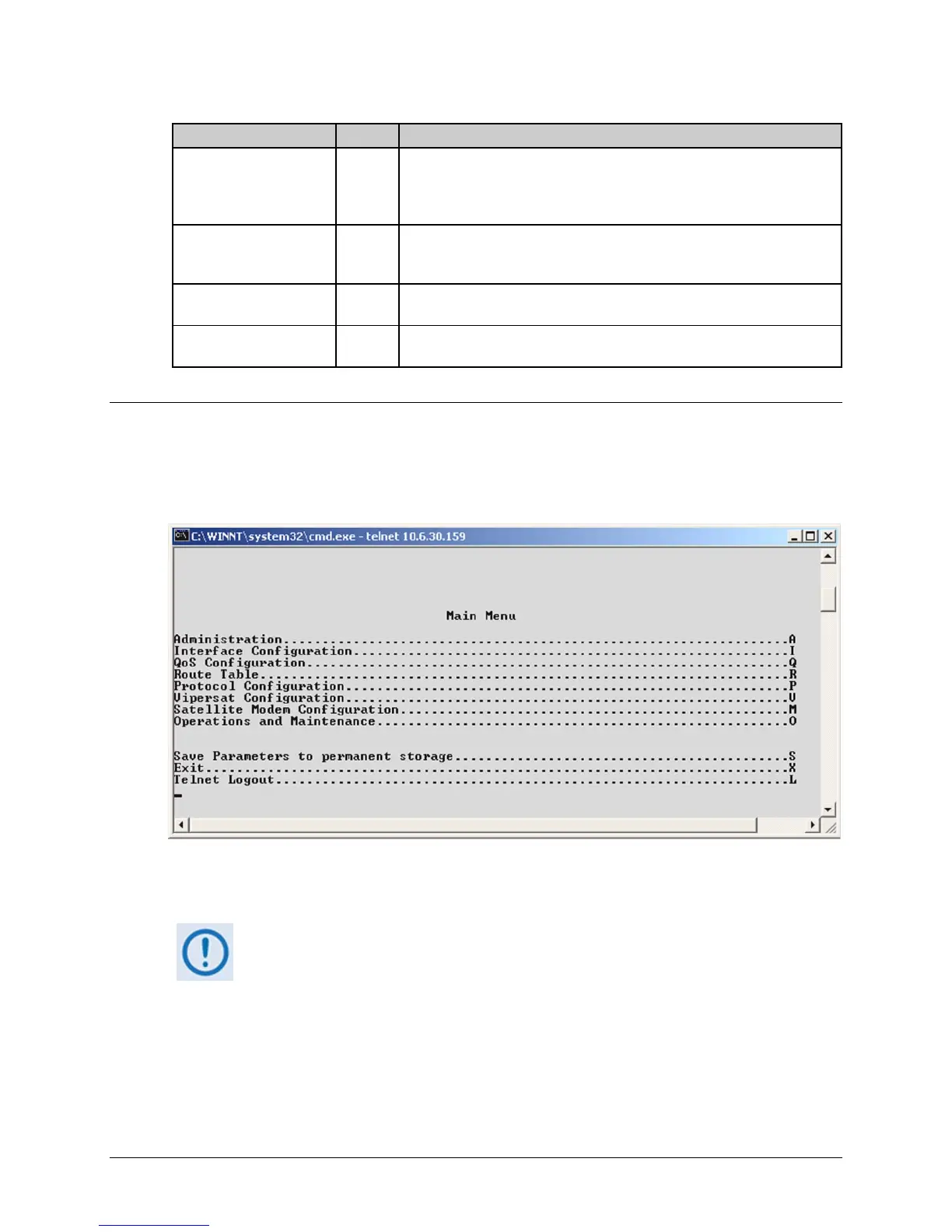 session is provided on all menus. This option, when selected, terminates the Telnet session and