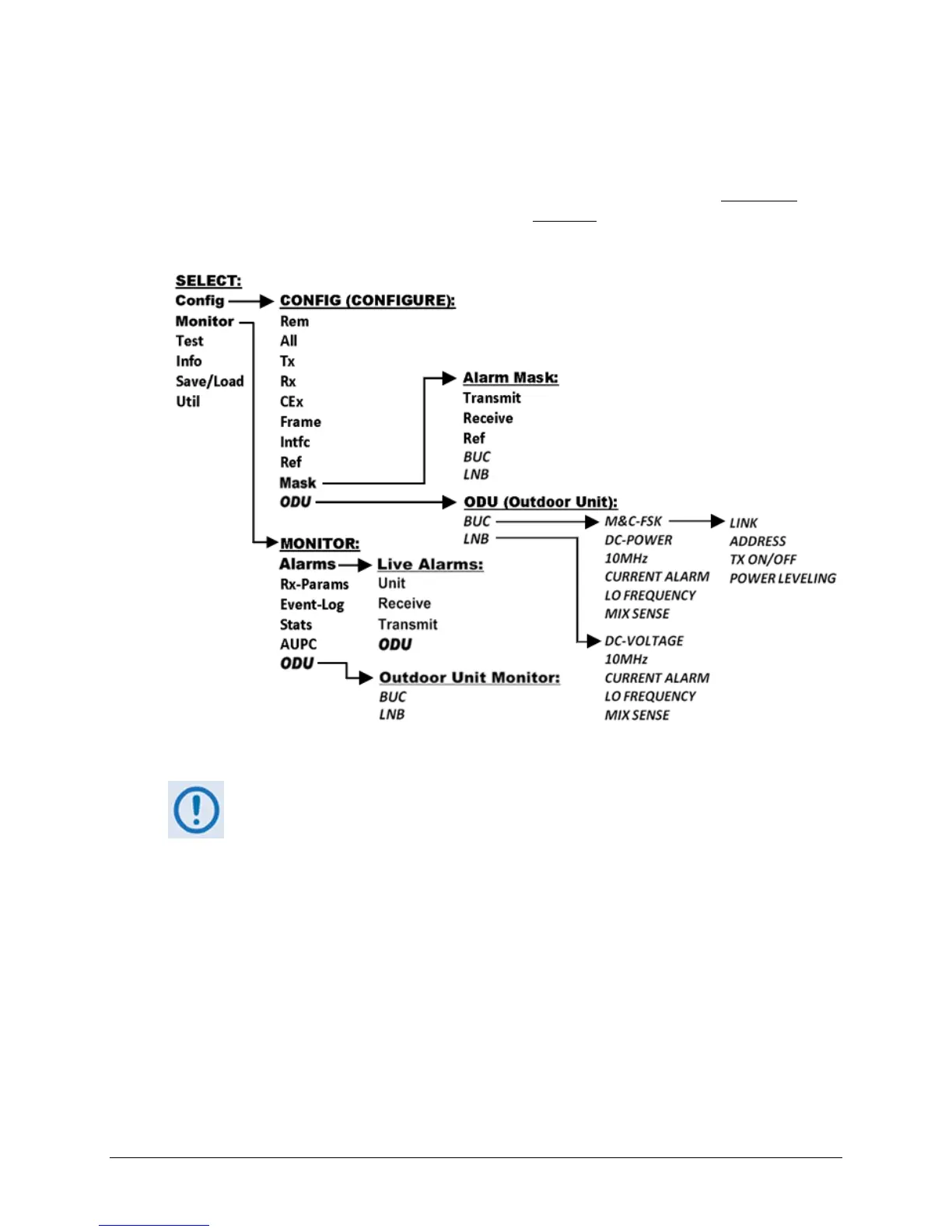 monitor and control of a BUC or LNB. More specifically, menu branches that incorporate