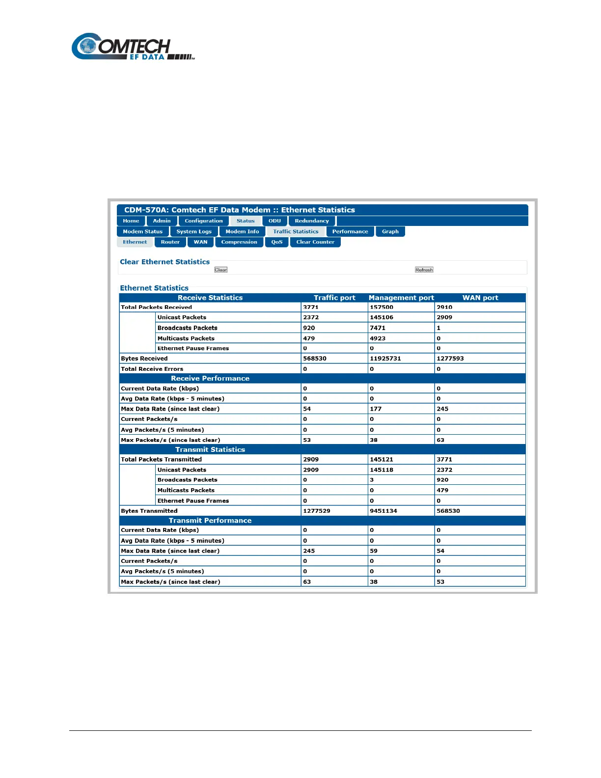 Comtech EF Data cdm-570a - Status | Traffic Statistics; Status | Traffic Statistics | Ethernet