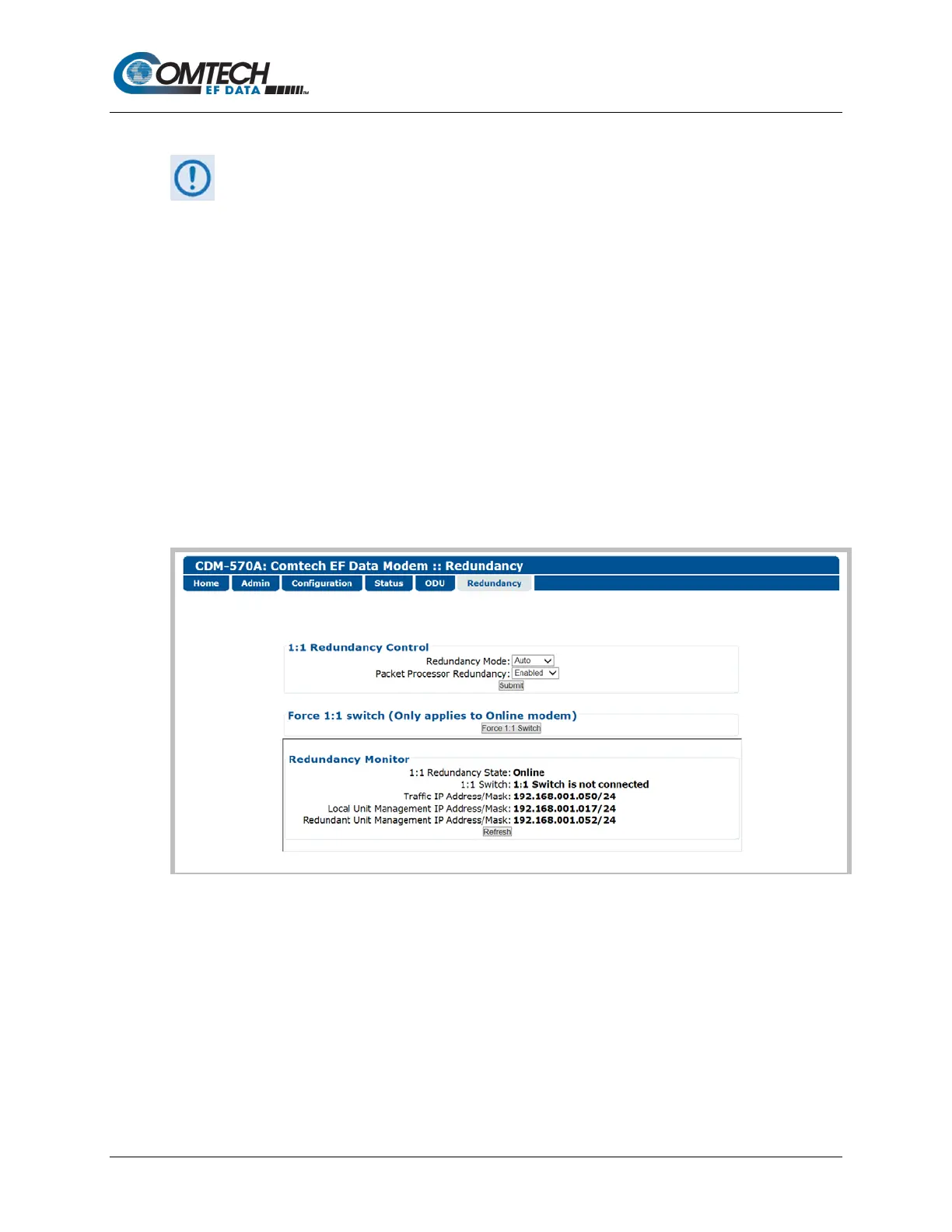1. This page is functional only when a Comtech EF Data Redundancy Switch is