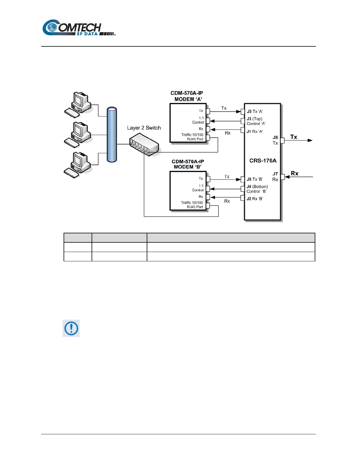 the Tx IF from Modem ‘A’ connects to the Tx IF port ‘A’ on the CRS-180, and Modem ‘B’ connects