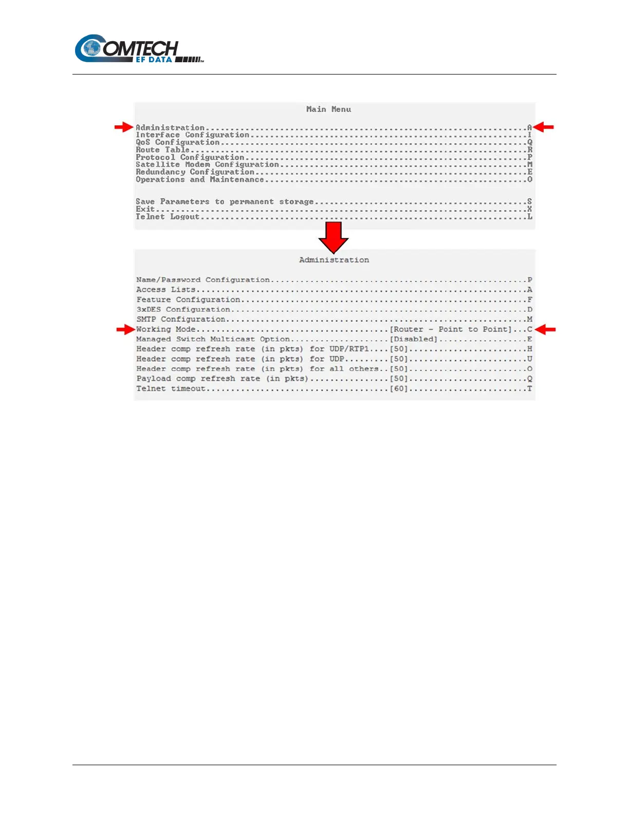 • On the Administration menu, press ‘C’ to display the Working Mode choices. Press ‘5’