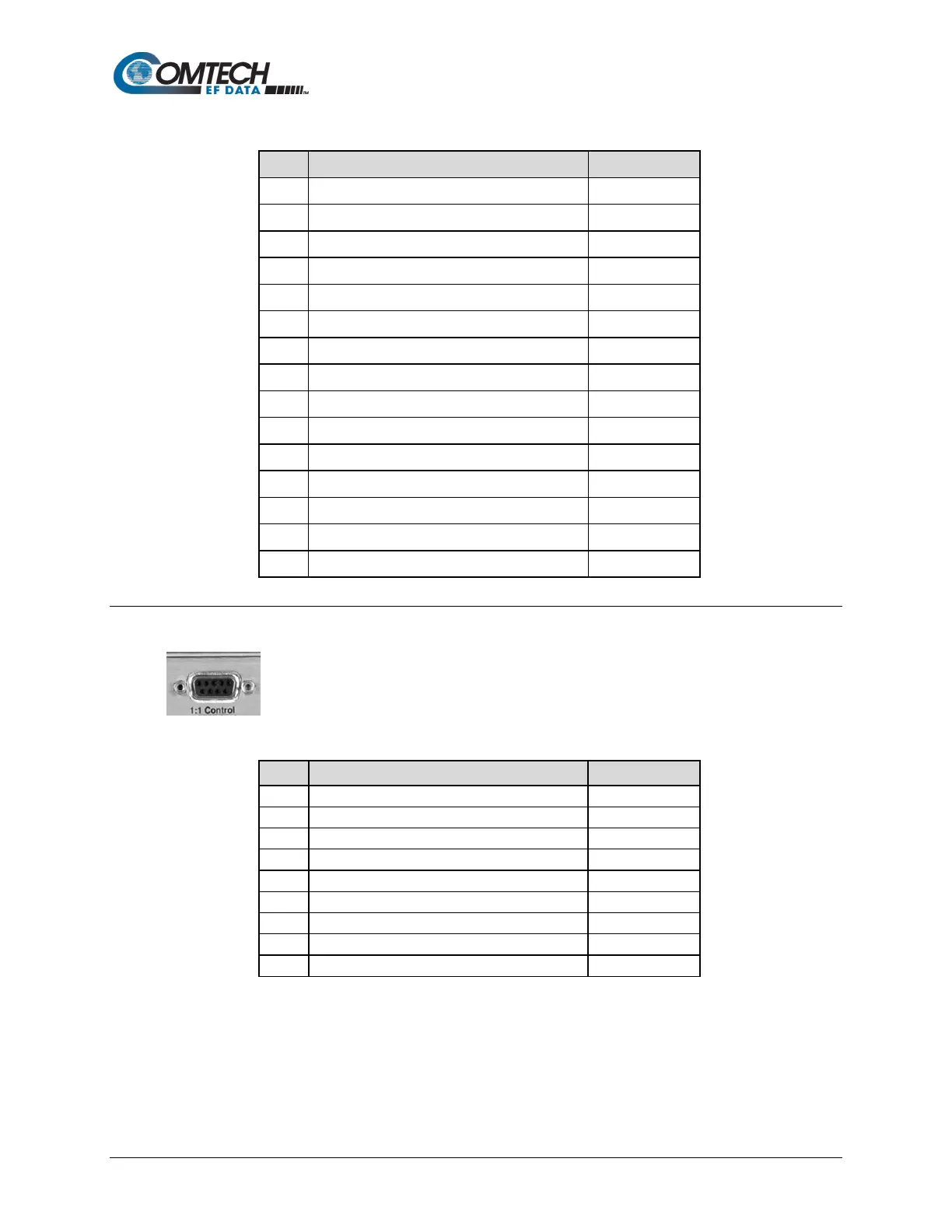 Comtech EF Data CDM-570AL - 1:1 Control Connector, DB-9 F; Table 3-6. Alarms Connector Pin Assignments; Table 3-7. 1:1 Control Connector Pin Assignments