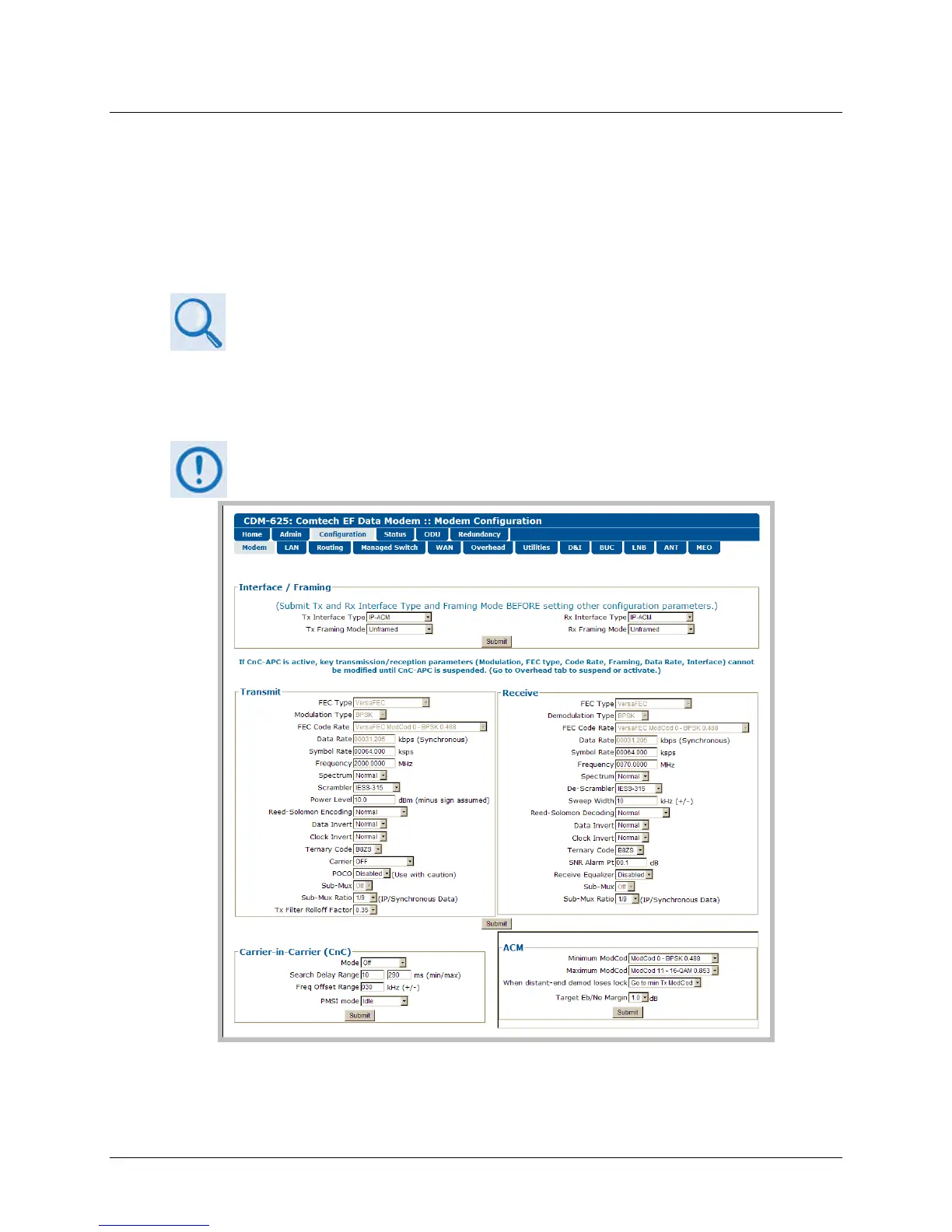 Use the ‘Configuration’ pages to configure all operating parameters for the CDM-625, including