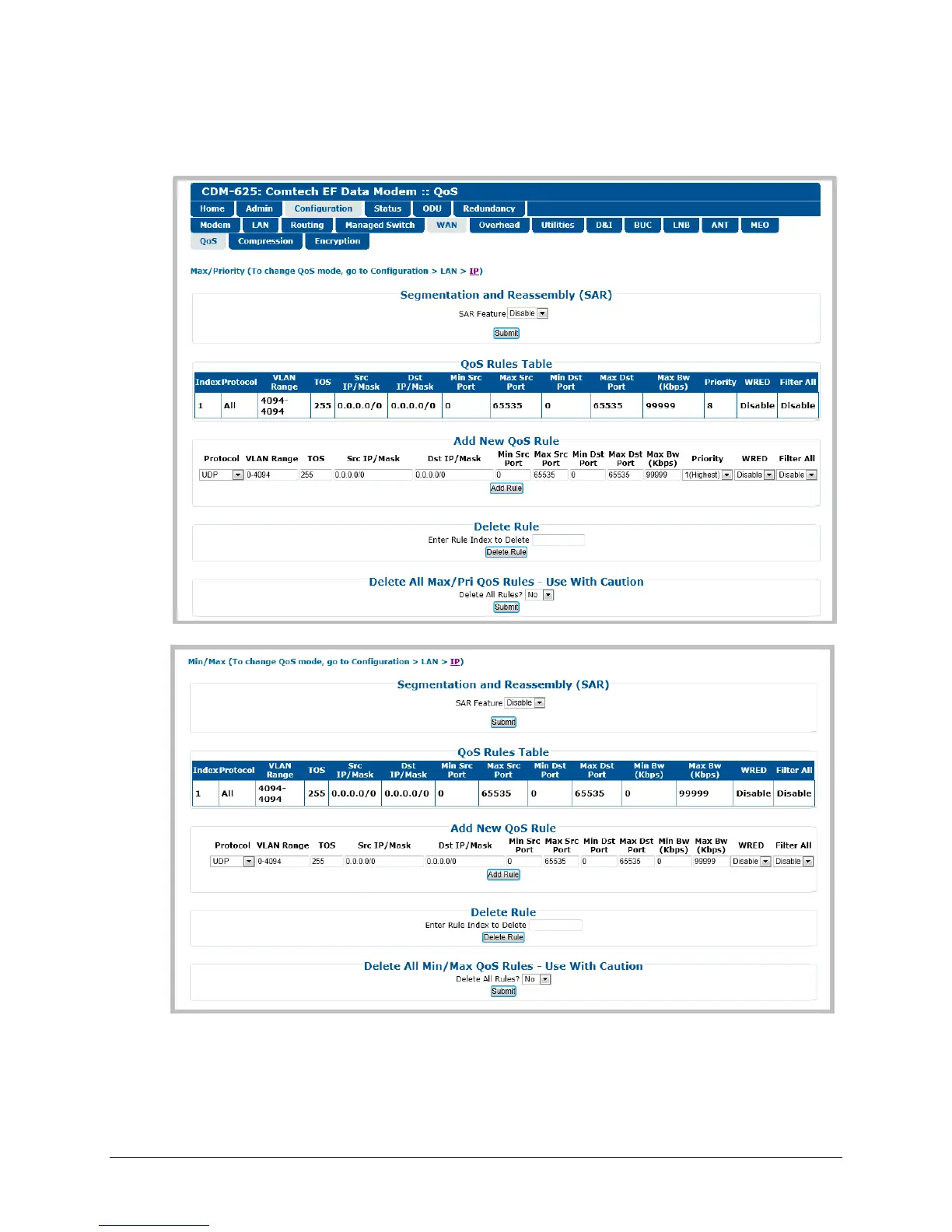 6.5.4.3.5.1.1 Configuration | WAN | QoS Pages – Max/Priority, Min/Max