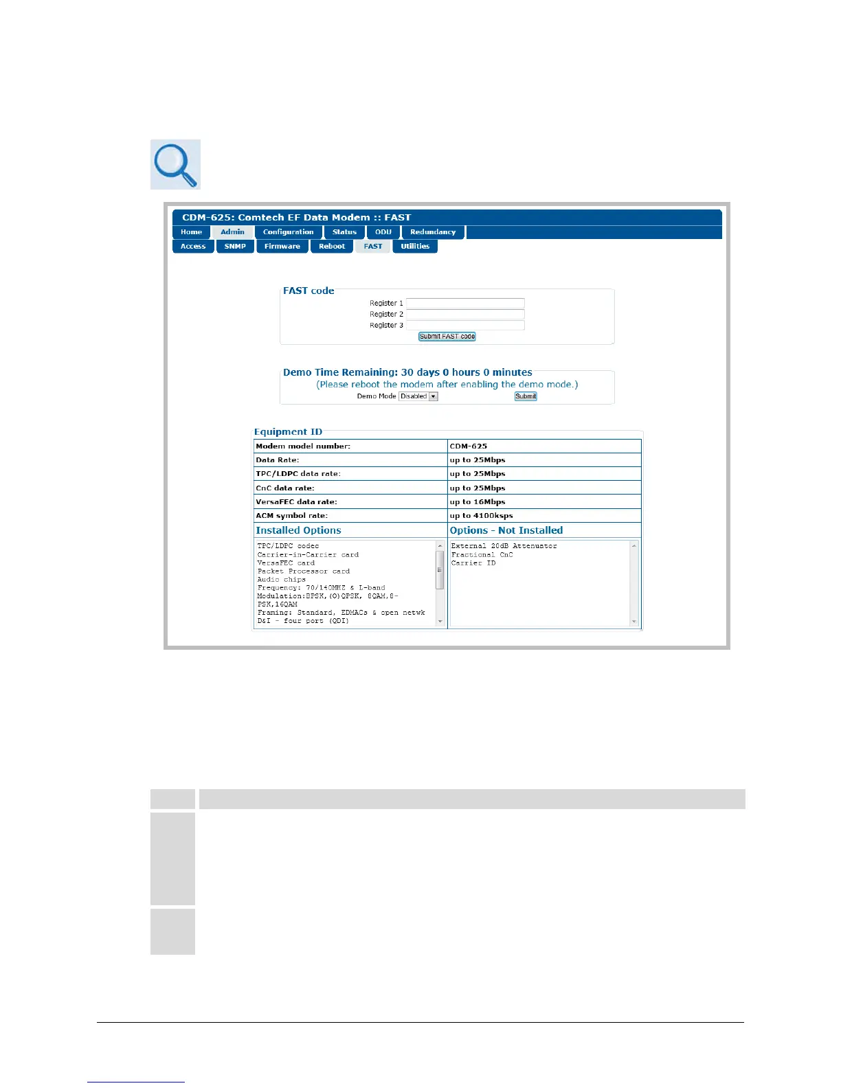 Use the CDM-625 Web Server (HTTP) Interface ‘Admin | FAST’ page (Figure C-1) for complete