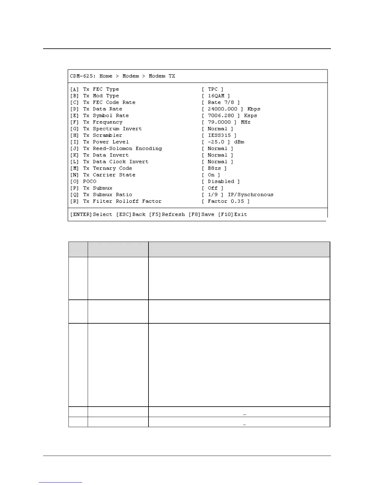 Open the Modem TX page from the Modem submenu. This page contains the following options:
