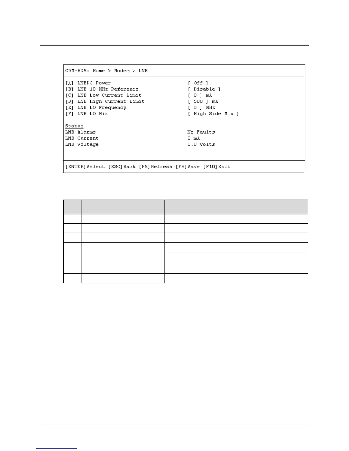 Open the (Low-Noise Block Downconverter) LNB page from the Modem submenu. This page