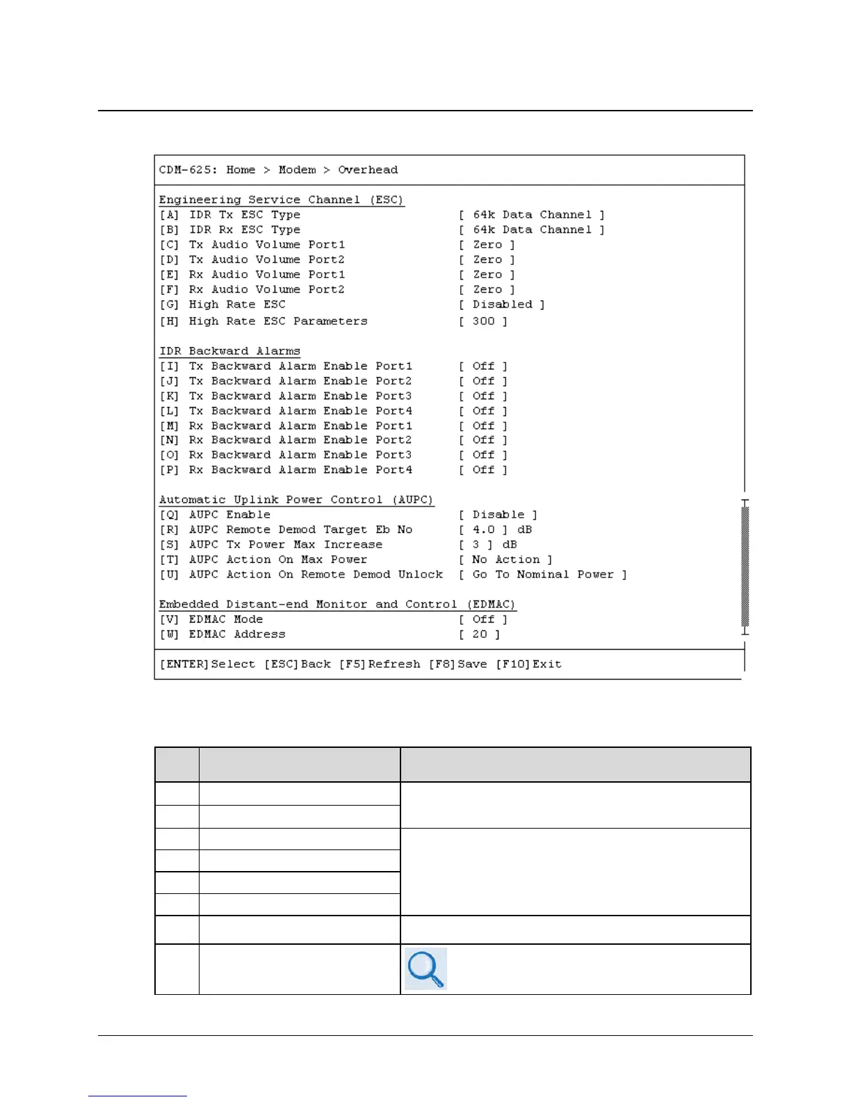 Open the scrollable Overhead page from the Modem submenu. This page contains the following