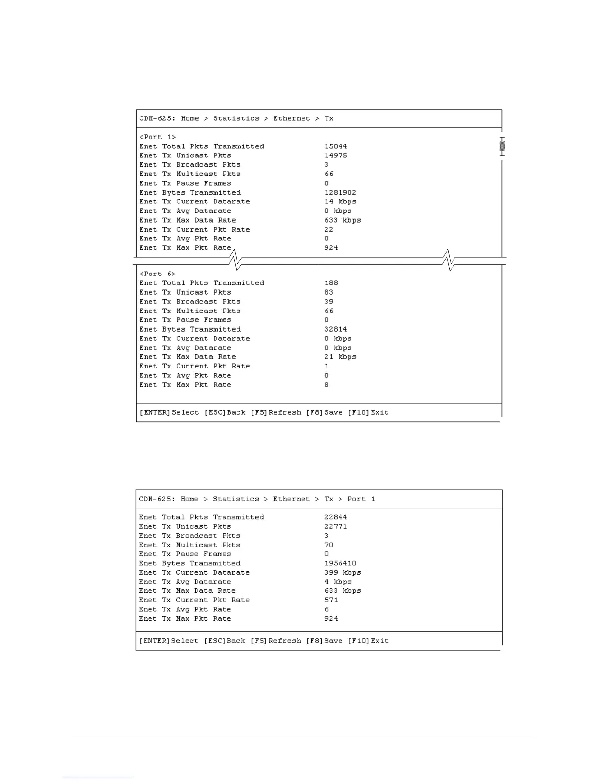 Open the scrollable Tx statistics page from the nested Ethernet submenu. Use the ↑↓ arrow
