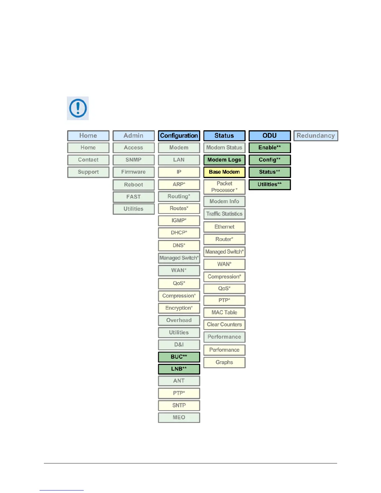 Pages marked with double asterisks (**) are operable only when BUCs or LNBs