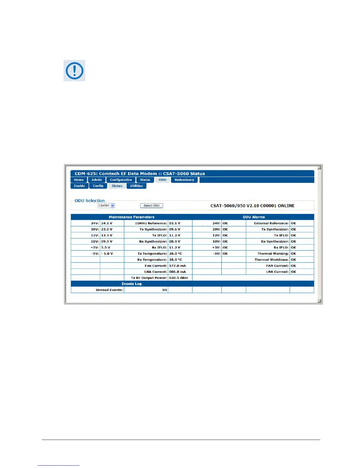 ODU’s Maintenance Parameters; Alarms; and the number of Unread Events in the Events Log.