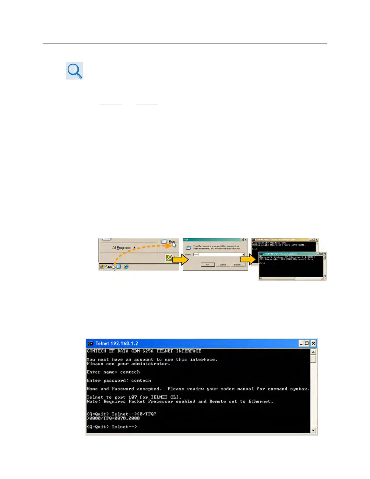 Do these steps to use Windows Command-line to access the CDM-625A Telnet Interface: