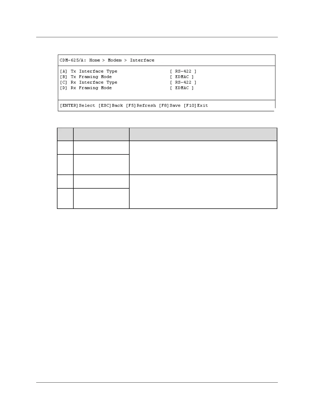 Open the Interface page from the Modem submenu. This page contains the following options: