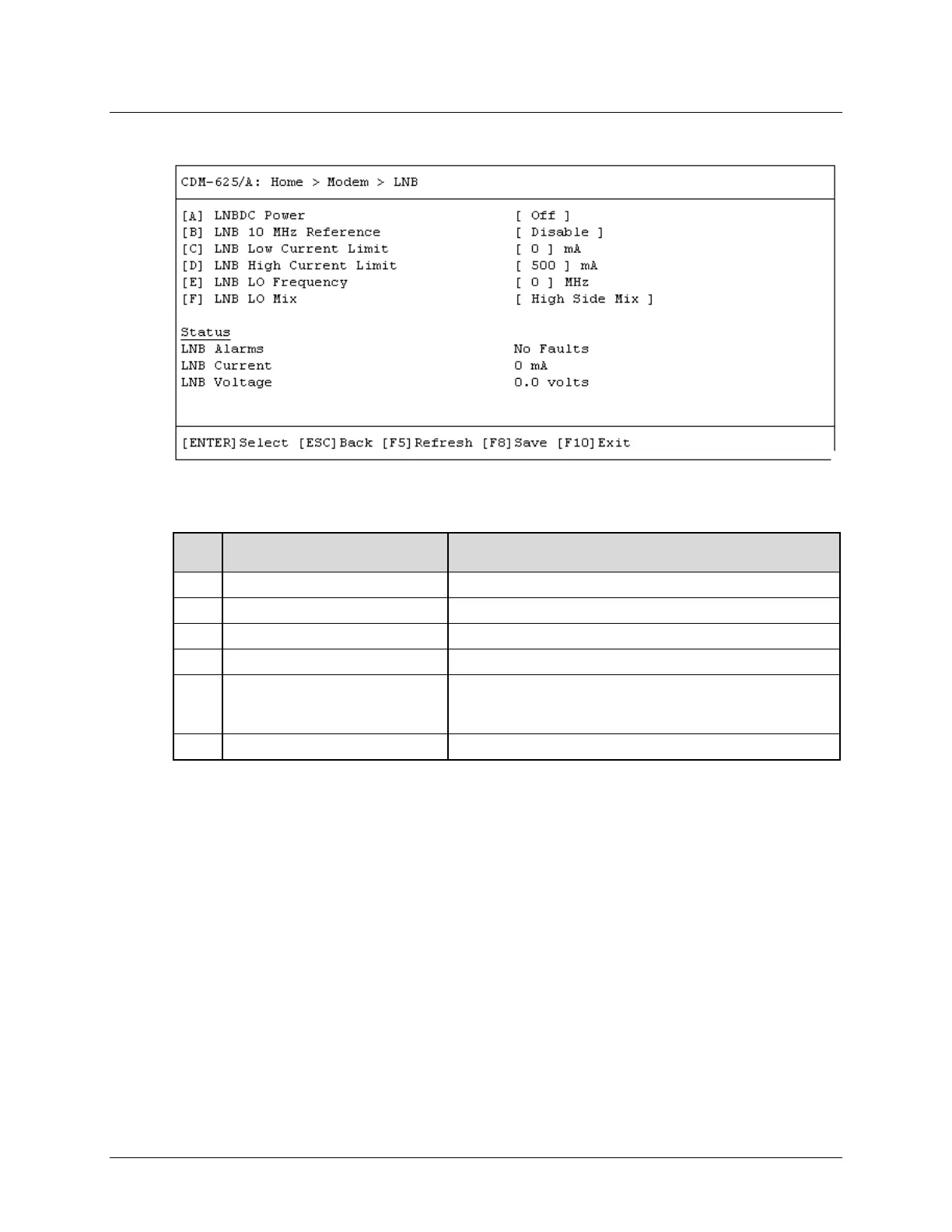 Open the (Low-Noise Block Downconverter) LNB page from the Modem submenu. This page