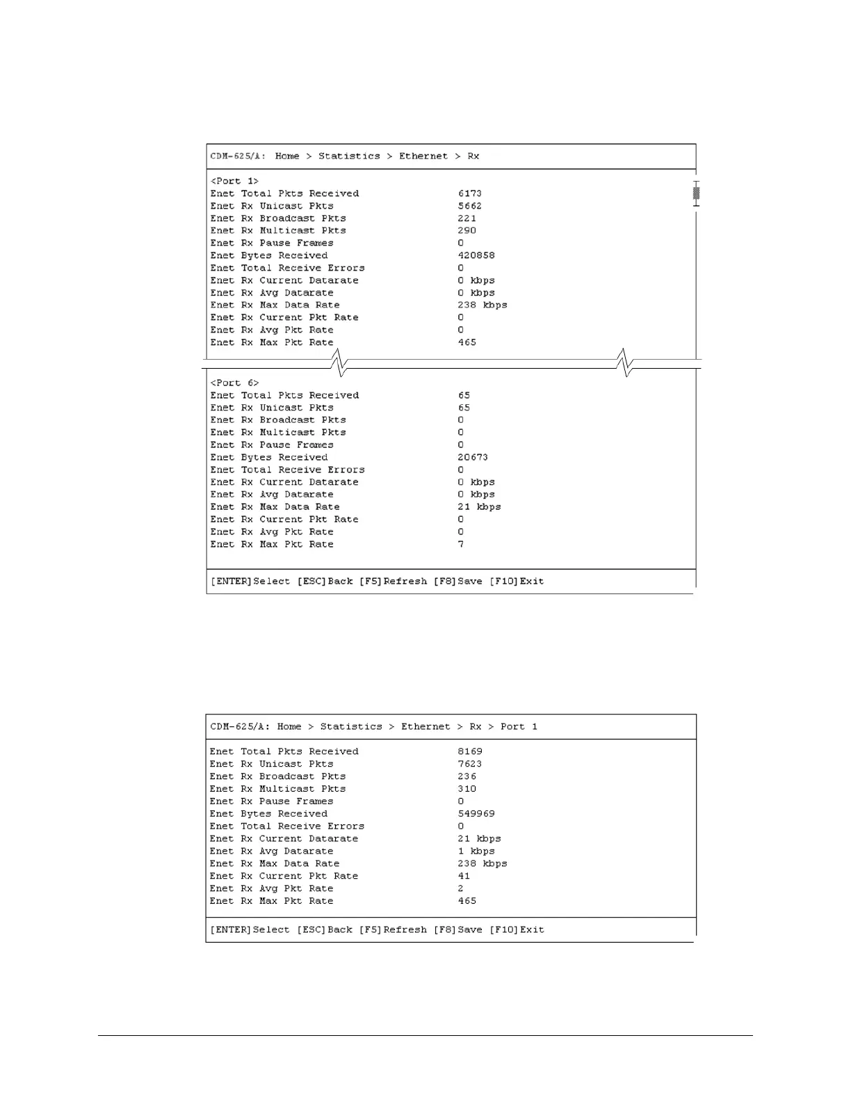 Open the scrollable Rx statistics page from the nested Ethernet submenu. Use the ↑↓ arrow
