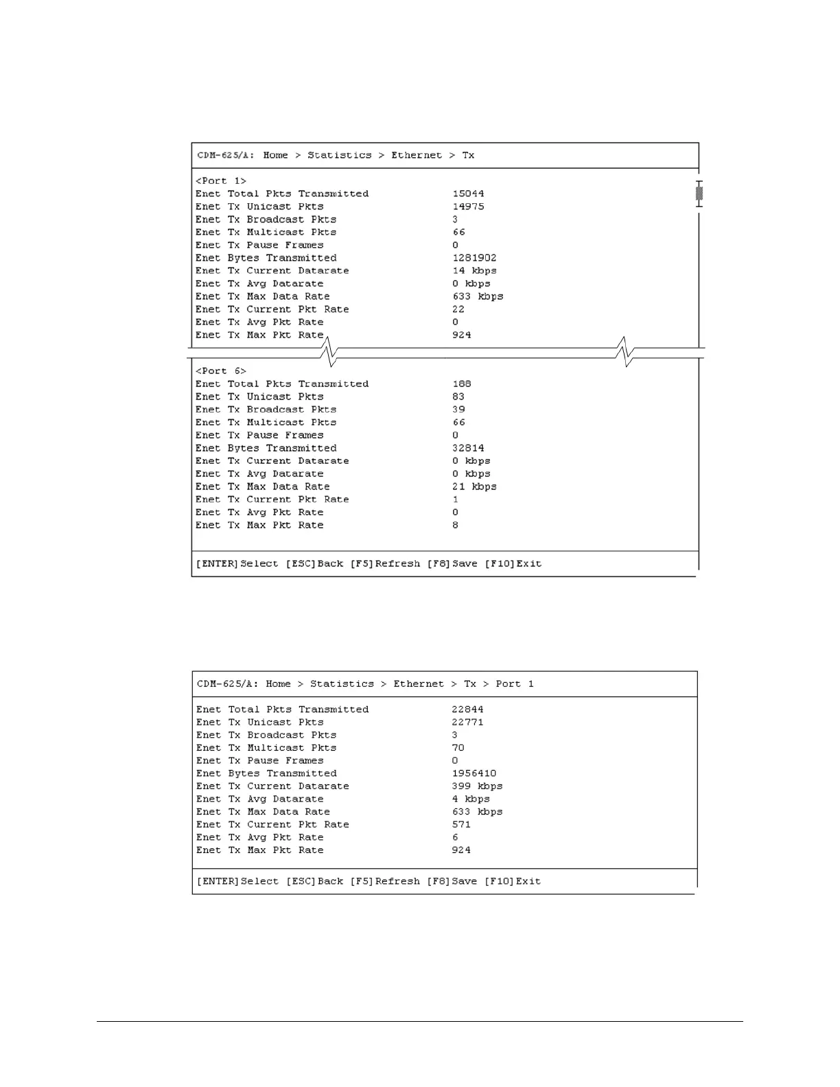 Open the scrollable Tx statistics page from the nested Ethernet submenu. Use the ↑↓ arrow