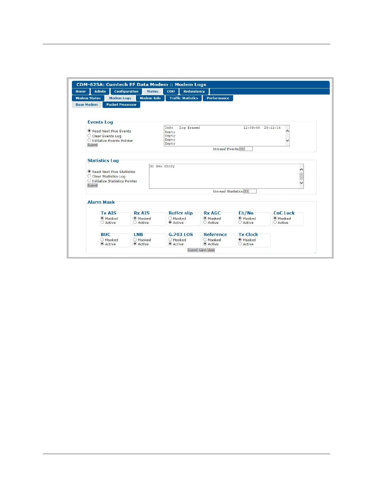 10.4.2.3 Status | Modem Logs | Base Modem Page