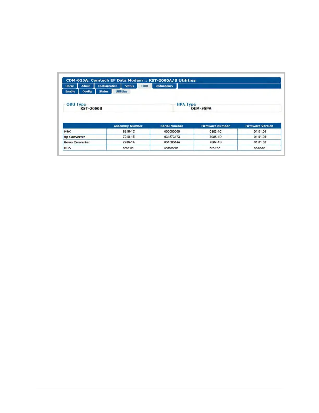 Figure 10-14 shows the read-only ‘ODU | Utilities’ page as it appears when you configure the