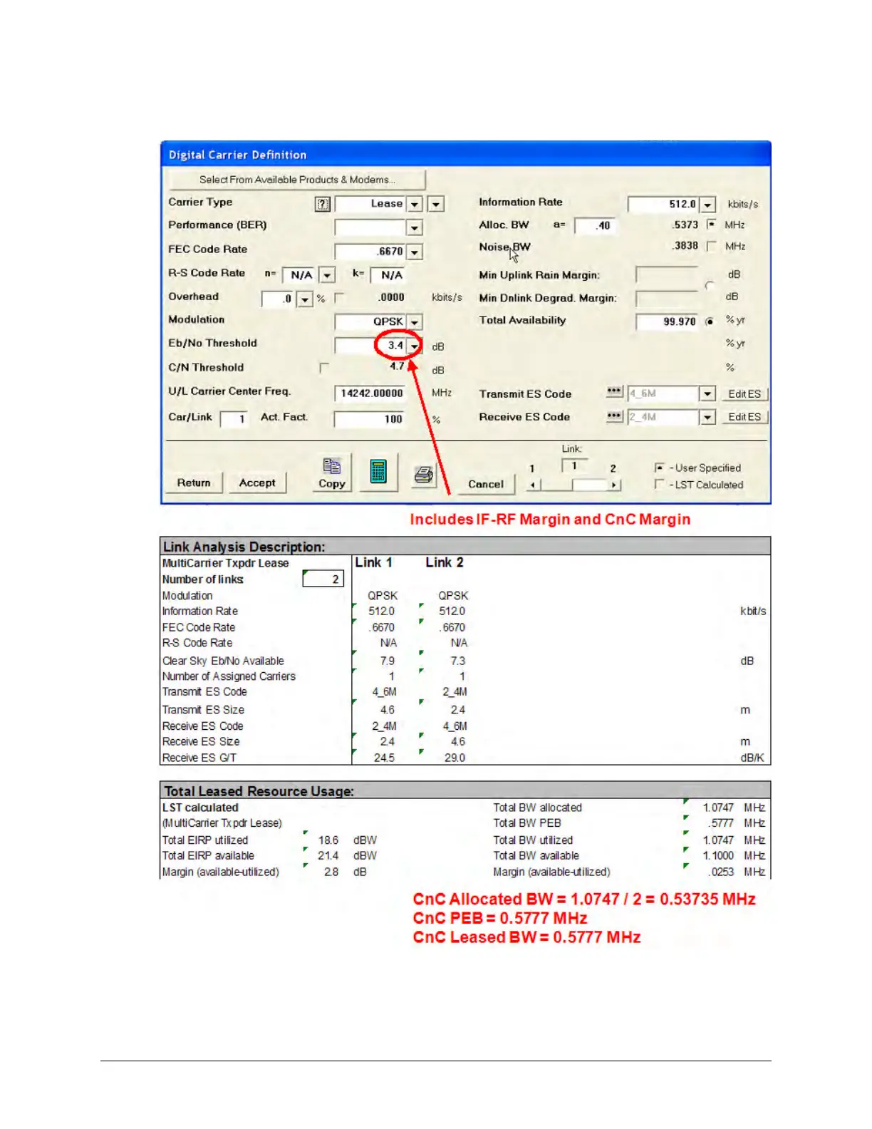 Link parameters and LST summary for QPSK, LDPC 2/3 with Carrier-in-Carrier is as follows: