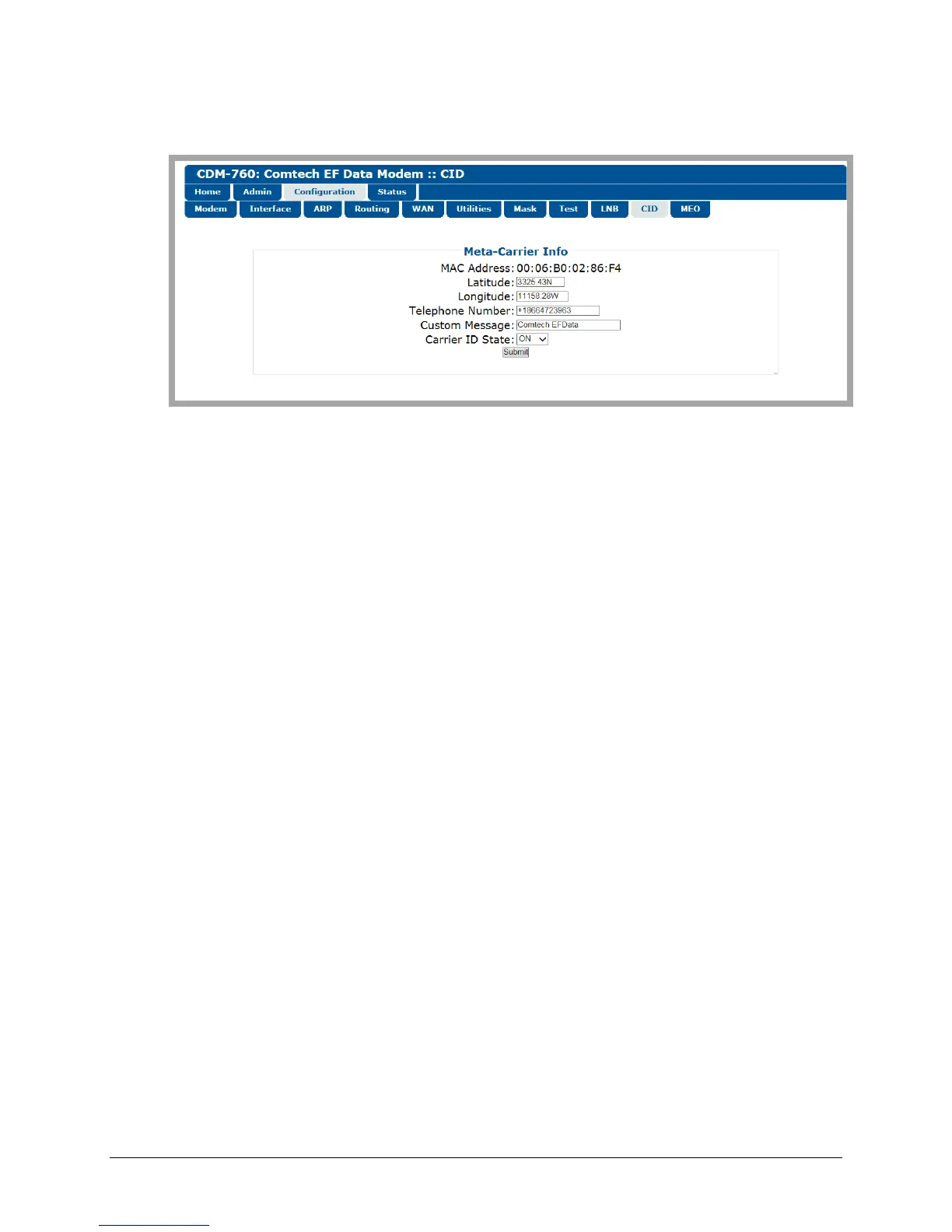 • The read- o nly MAC Address for the M&C card on the CDM-760 is displayed here.