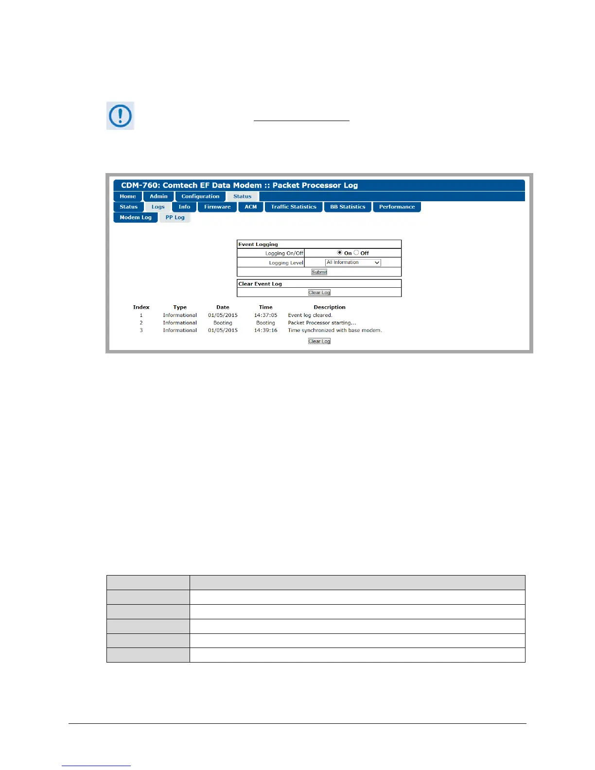 Click [Clear Log] to clear the log buffer and remove all event entries. The table then displays a