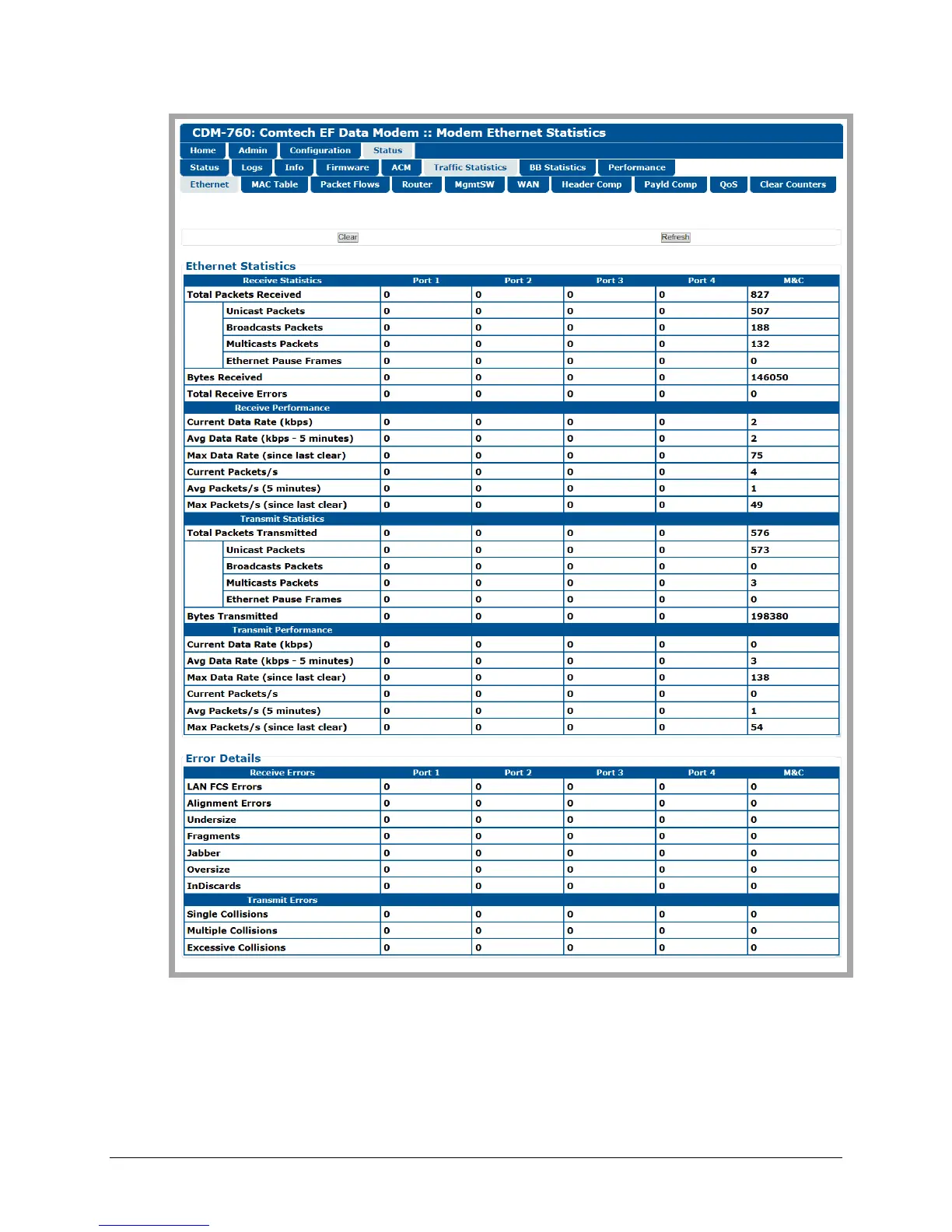 Comtech EF Data CDM-760 - Figure 7-35. Status | Traffic Statistics | Ethernet Page (Packet Processor Installed;Enabled)
