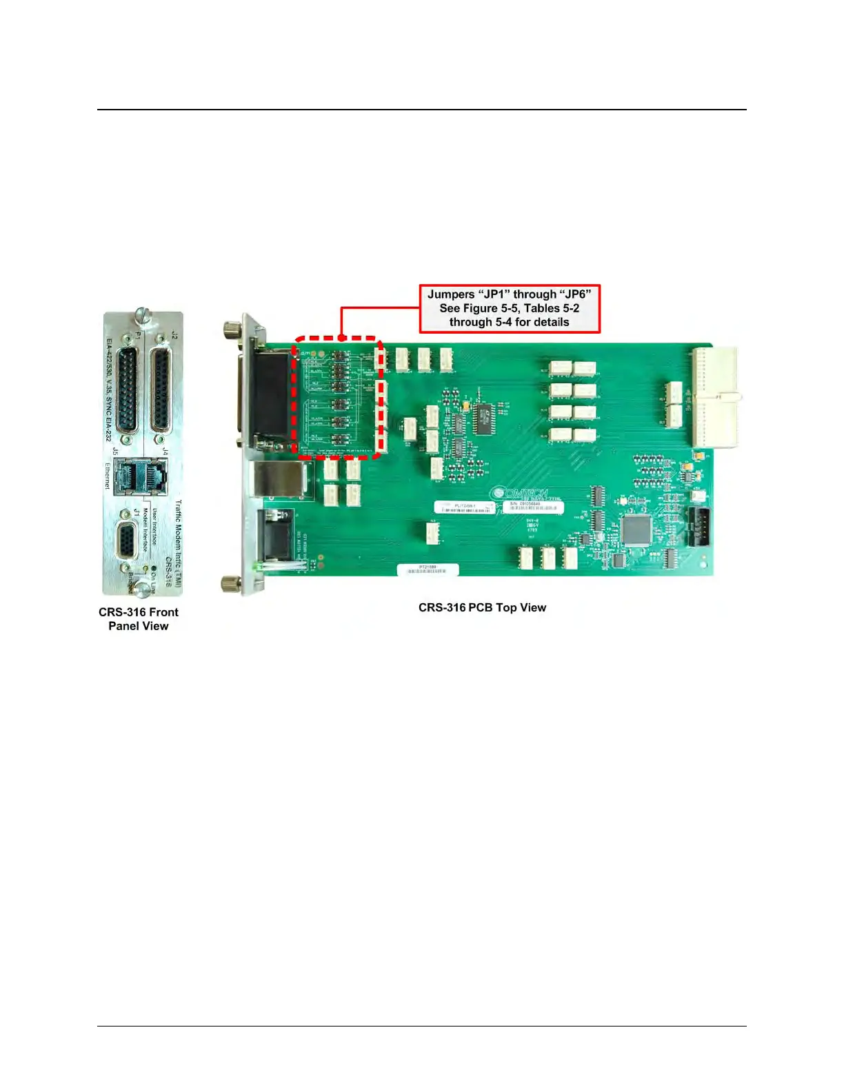 Figure 5-5 shows the jumper section of the CRS-316 TMI PCB. Comtech EF Data ships these TMIs