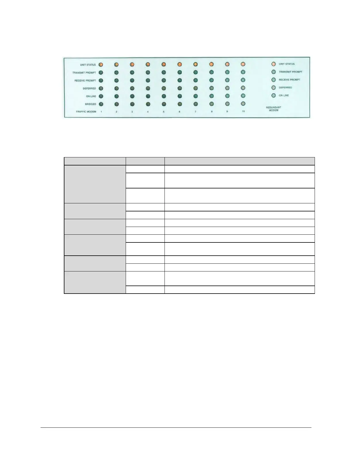 VFD, show the operational status for up to 10 Traffic Modems (six LEDs per modem) plus the