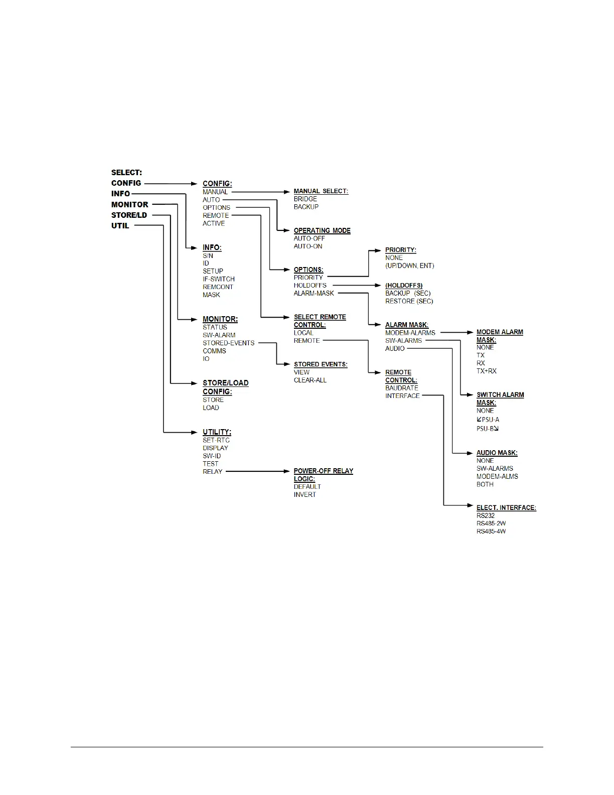 Figure 6-2 shows the menu structure of the CRS-300. The menu, branches, and applicable