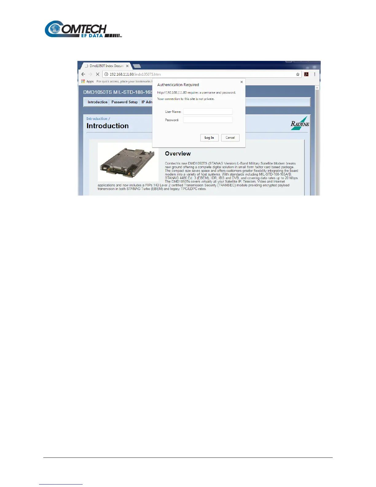 Log in, using the correct User Name and Password. The DMD1050TS is configured initially with