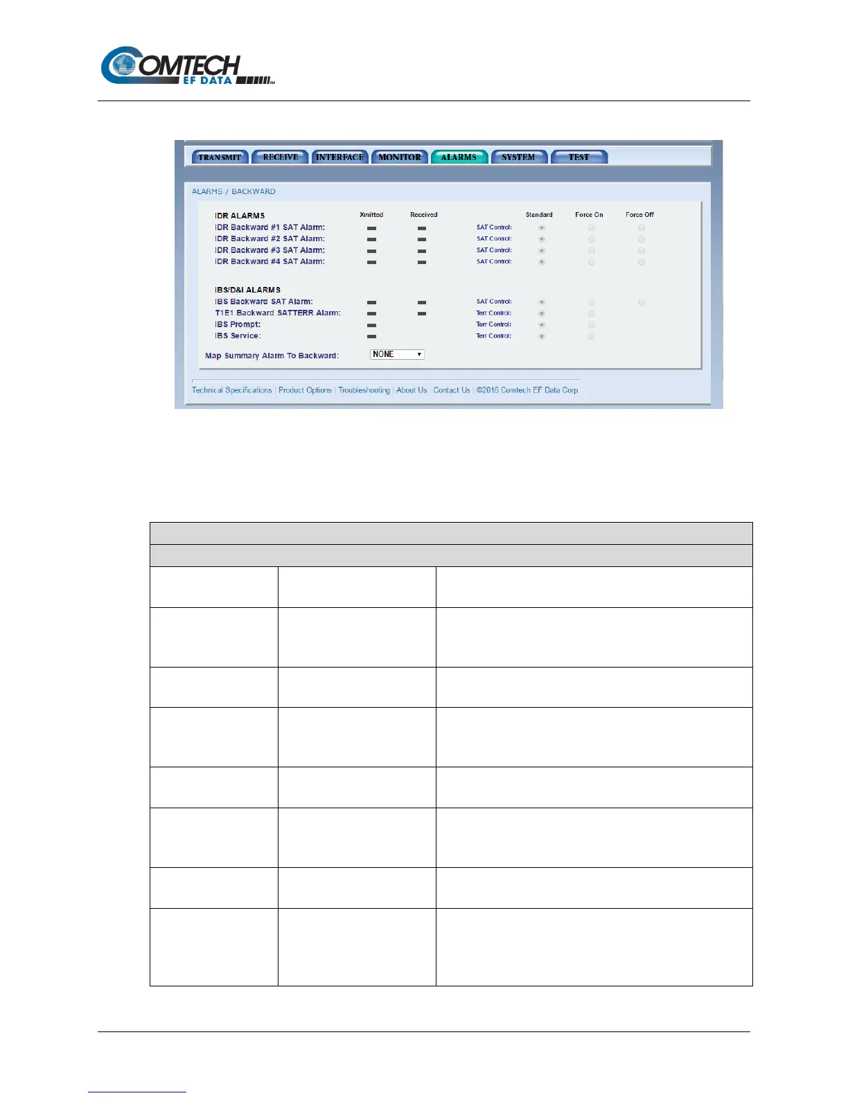 SNMP, Terminal Screens and RLLP. Physical contacts are not available for the backward alarms.