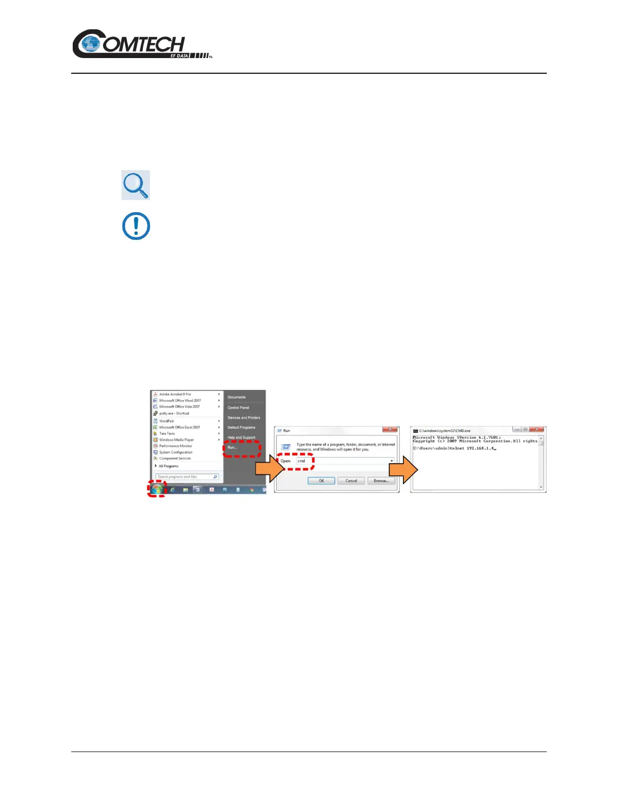 3. Enter the Telnet username and password (the default for both parameters is comtech):
