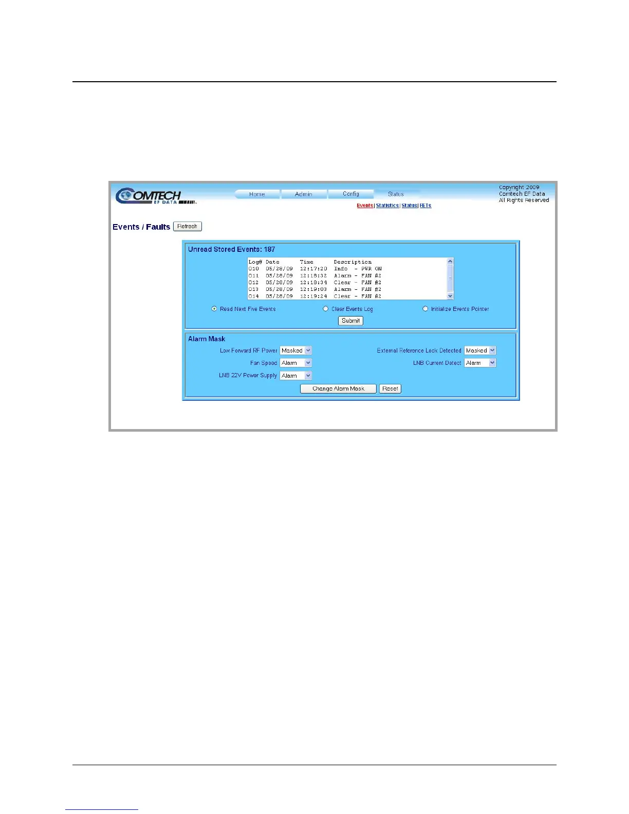 The ‘Status | Events’ page (Figure 4-10) provides the user with