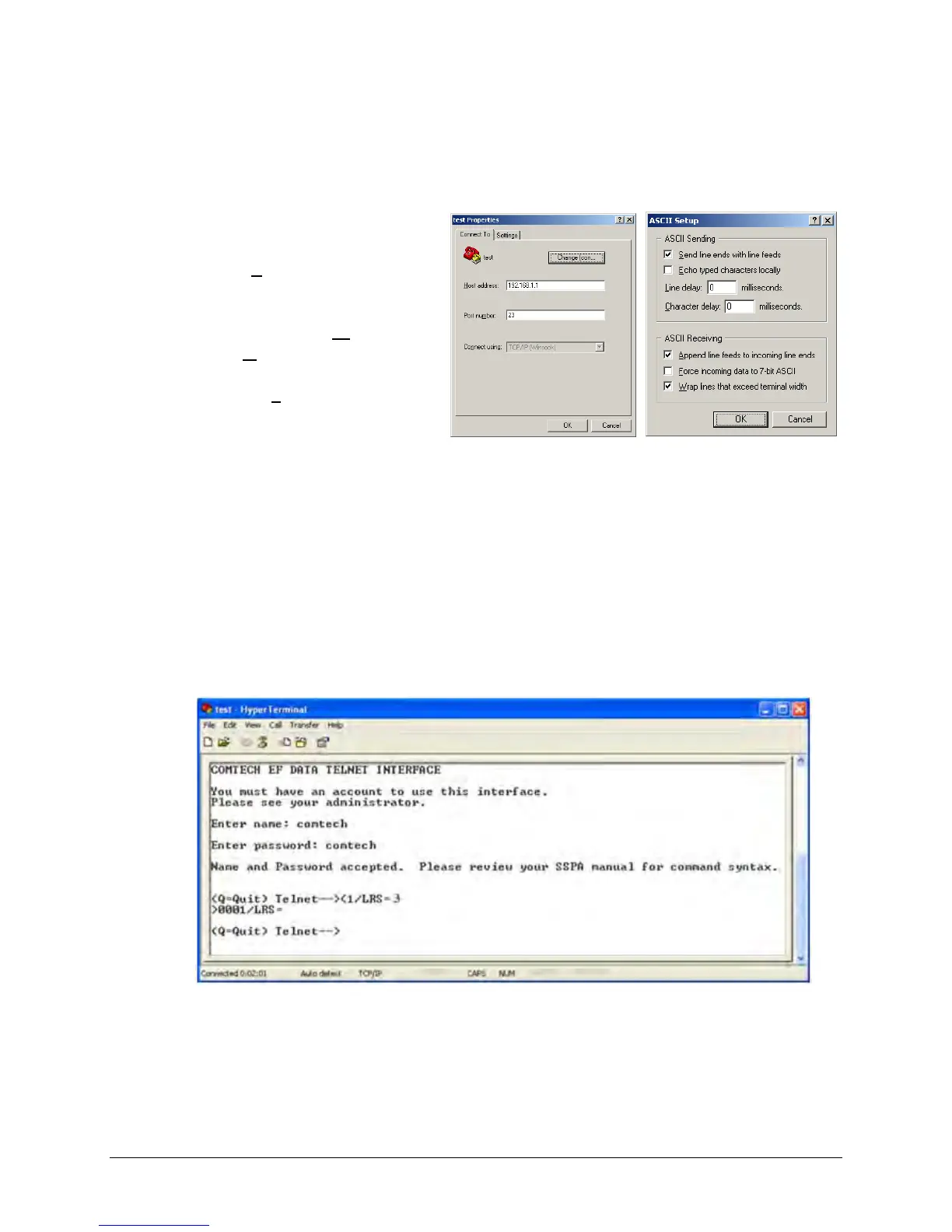 An example of login and remote command/query execution, when using HyperTerminal as the