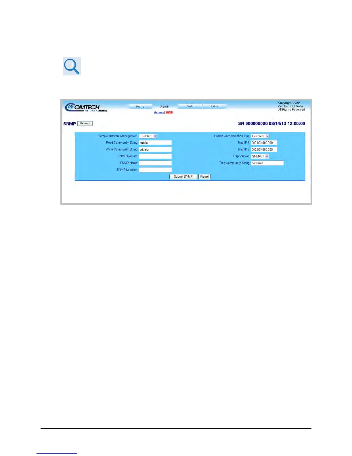of 0 to 20 characters. The factory default for the SNMP Trap Community String is comtech.