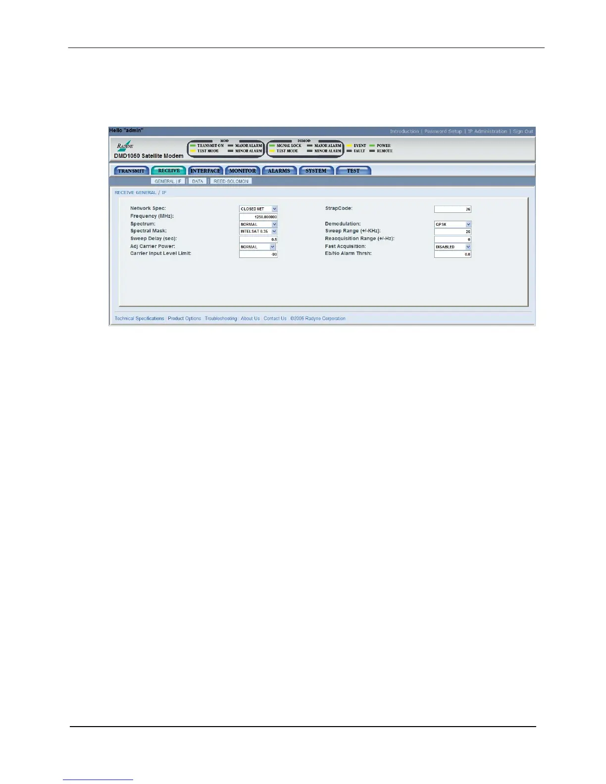 The Receive menu contains sub menus; General | IF, Data, Reed Solomon and ODU-LNB.