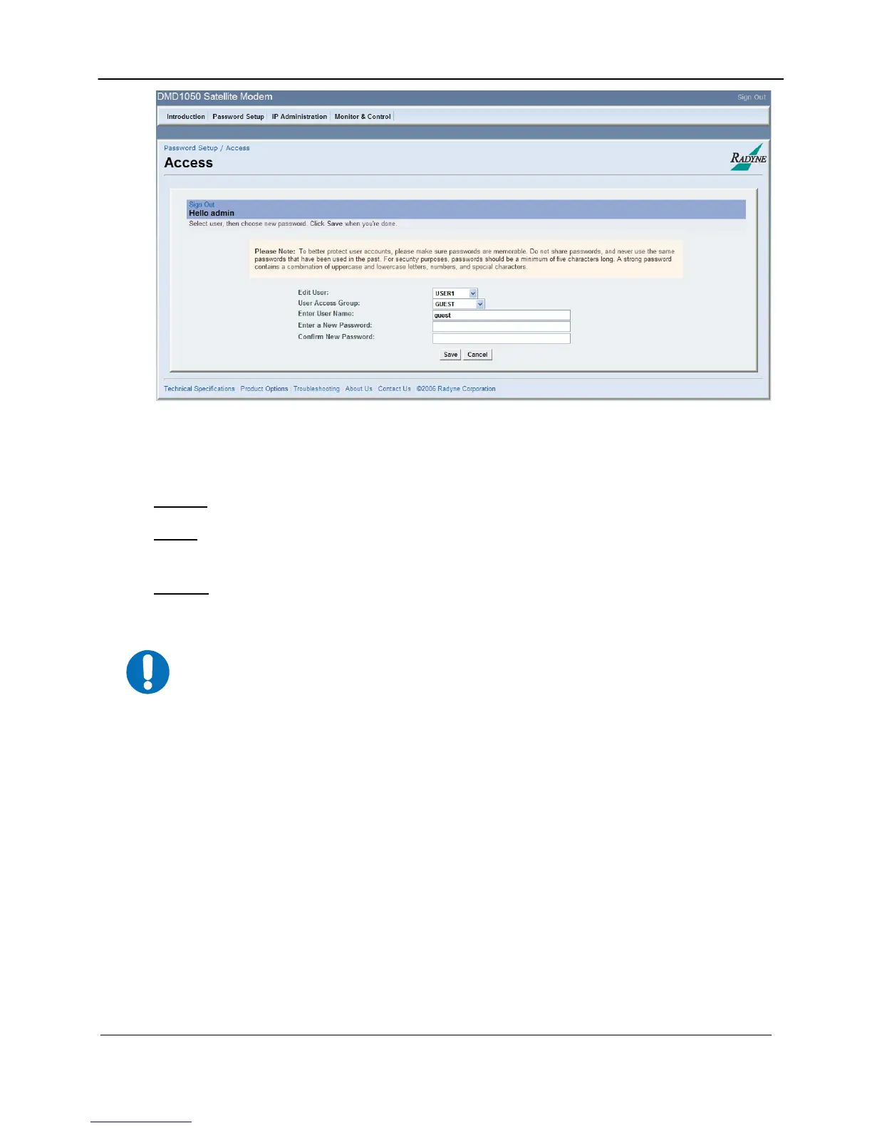 change any user’s name and authentication password, and modify IP network settings. Admin