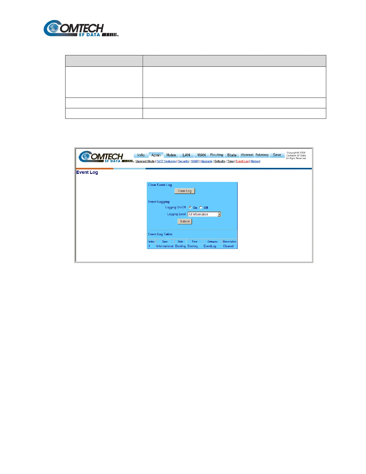 Click [Clear Log] to delete all existing log entries. The event log is reset to one (1) entry: “Eventlog
