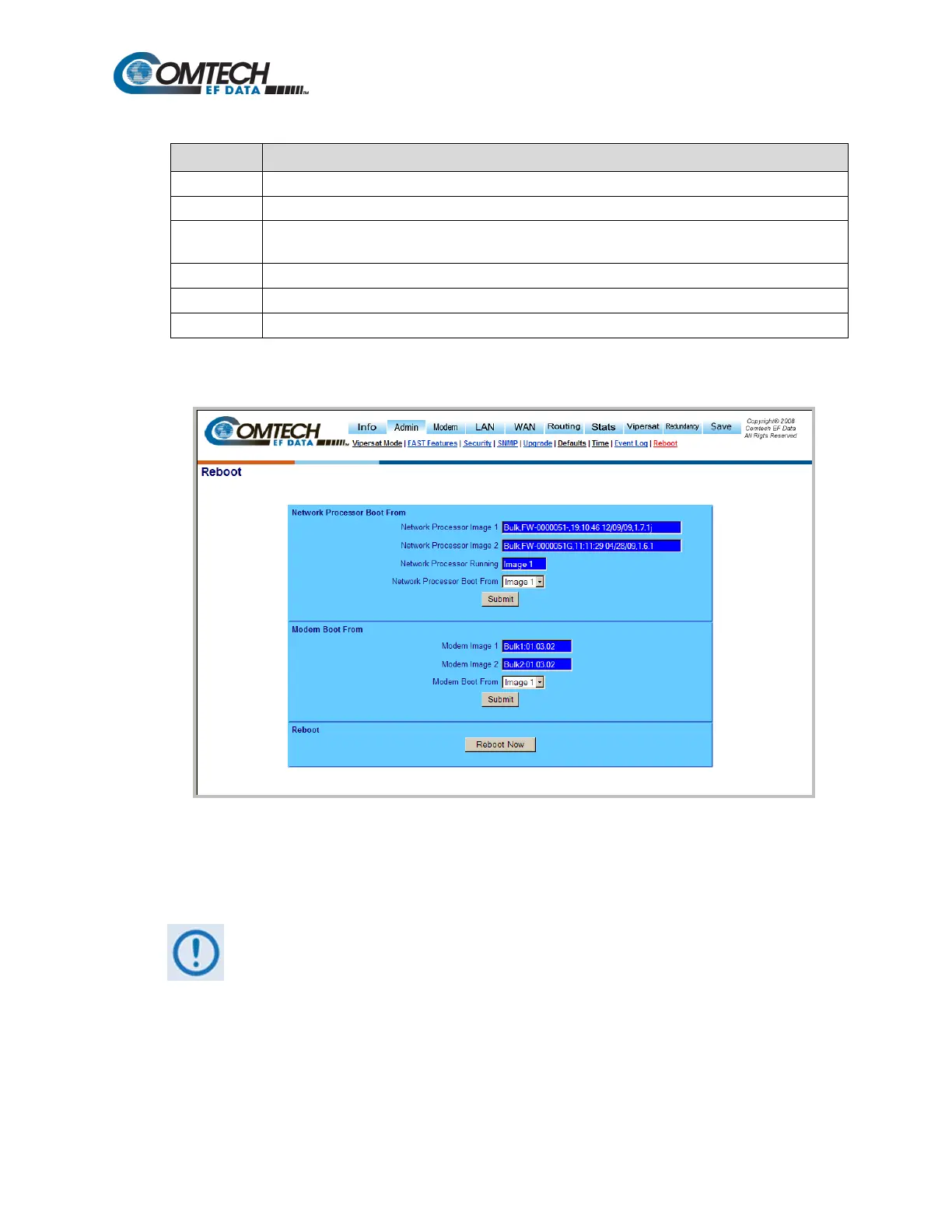 Use the ‘Admin | Reboot’ page (Figure 8-18) to display the currently available boot images for both