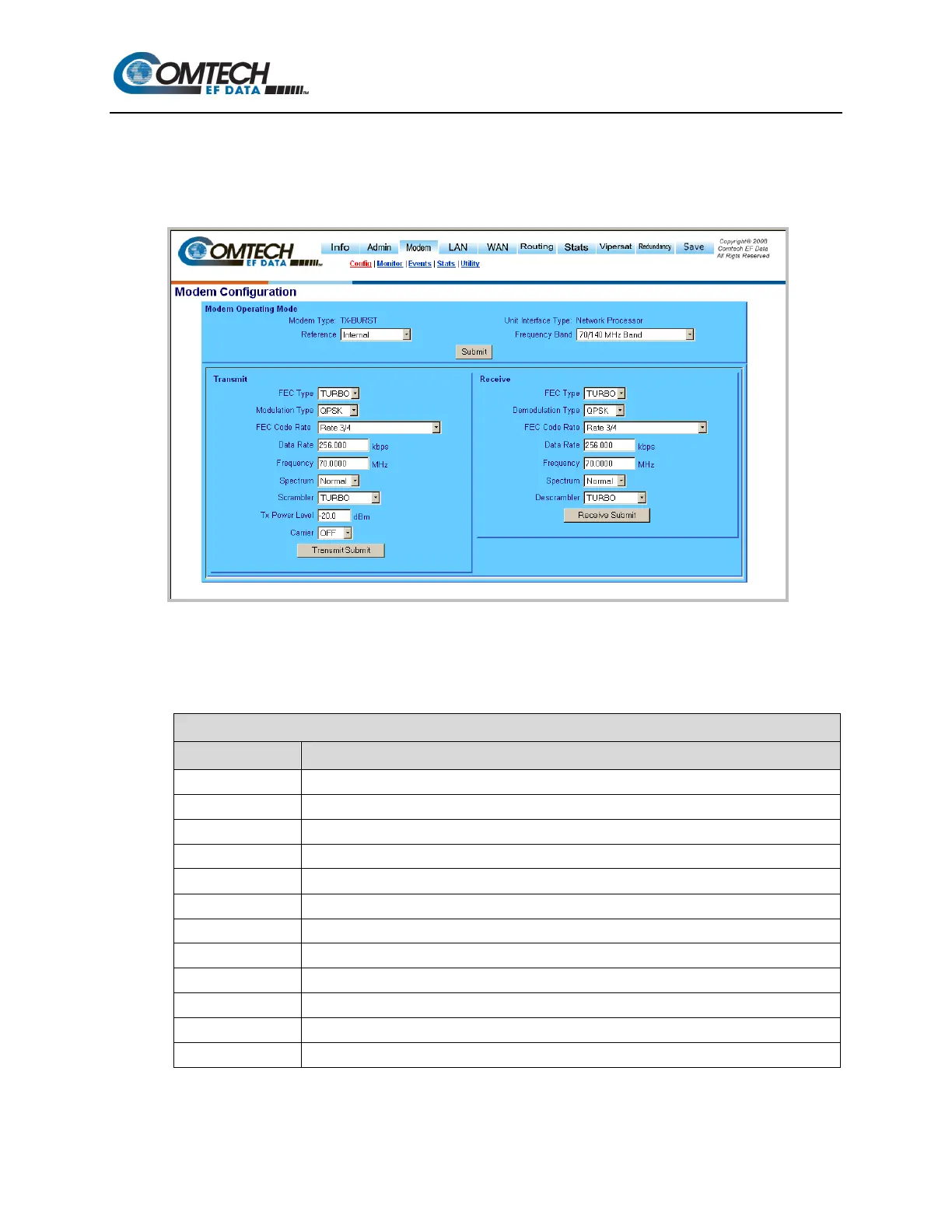 Use the Modem pages to configure or view the primary Transmit parameters and primary Receive