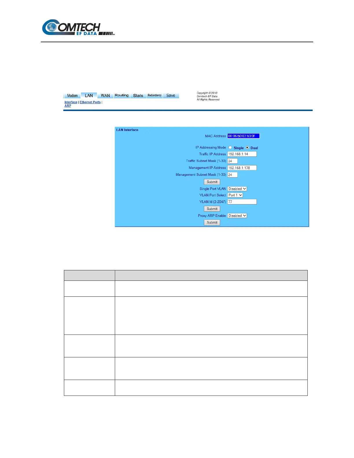 Use the ‘LAN | Interface’ page (Figure 8-24) to set LAN operating parameters, to view the MAC