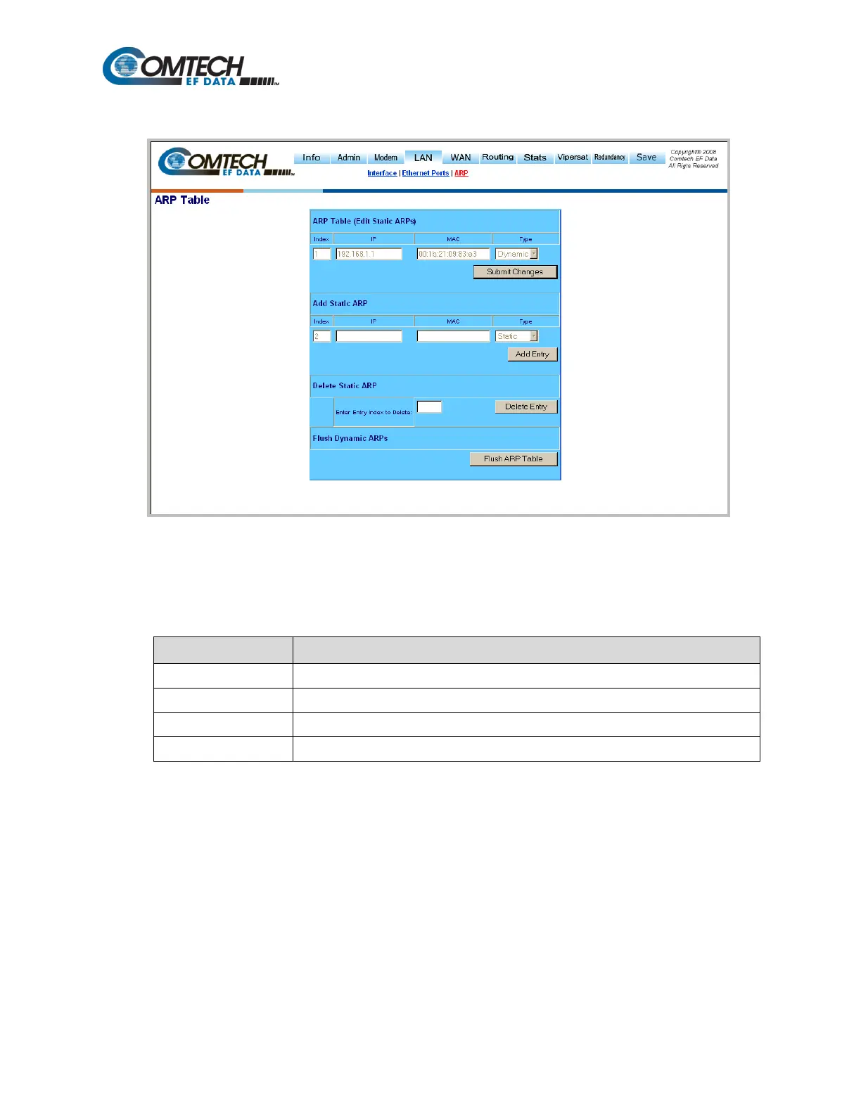 This table displays all current ARP entries (both Static and Dynamic). The current Static ARPs may