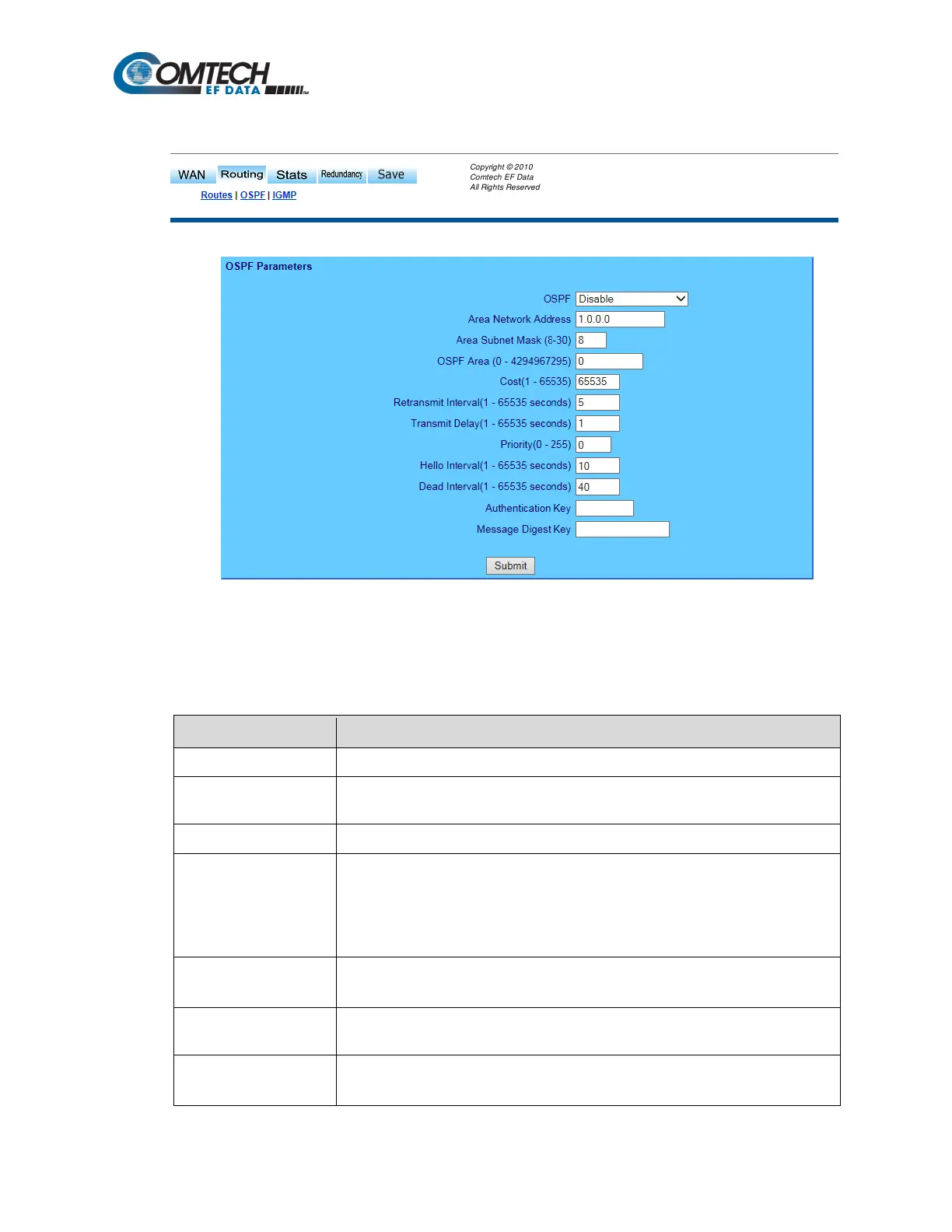Use the ‘Routing | OSPF’ page (Figure 8-31) to define the operating parameters for Open Shortest