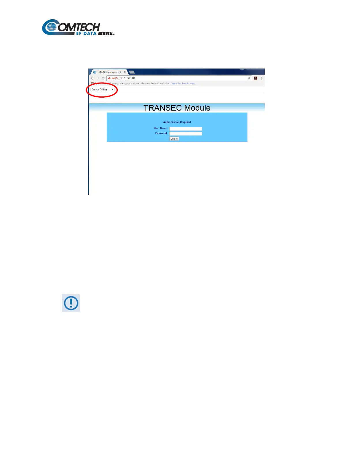 Crypto Officer: Connects to the secure TRANSEC Module HTTPS Interface (User Name and