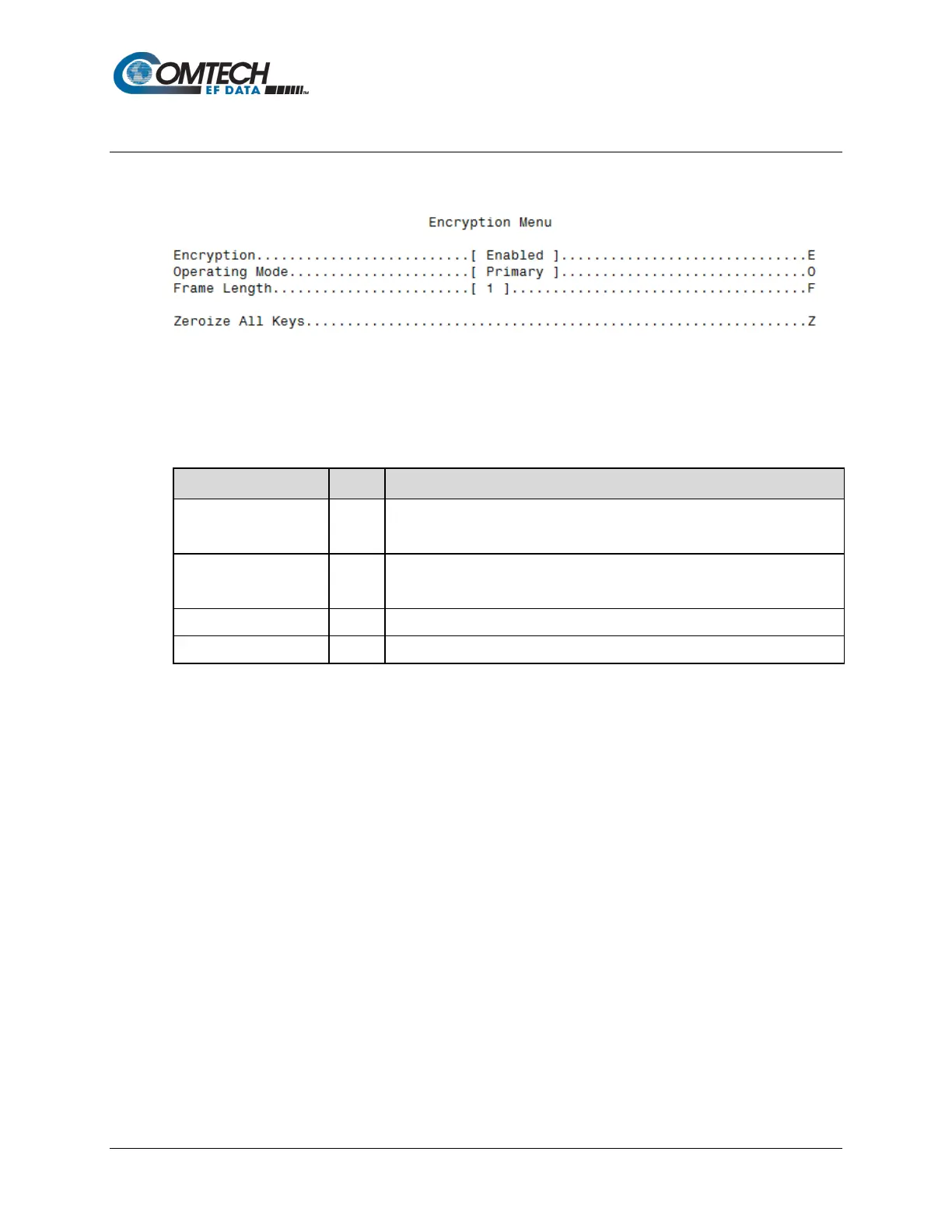 Encryption E Prompts user to sets the Encryption Mode operation: