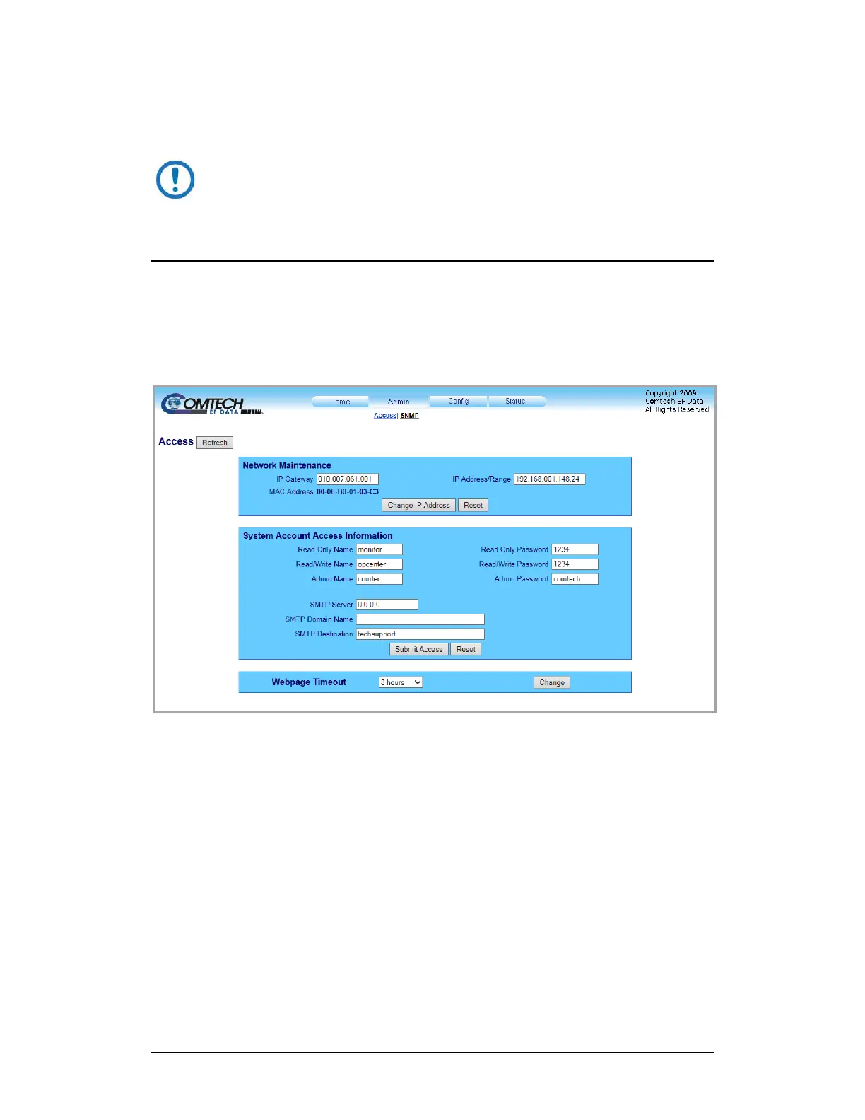 Click the Admin tab, and then select the Access or SNMP hyperlink to continue.