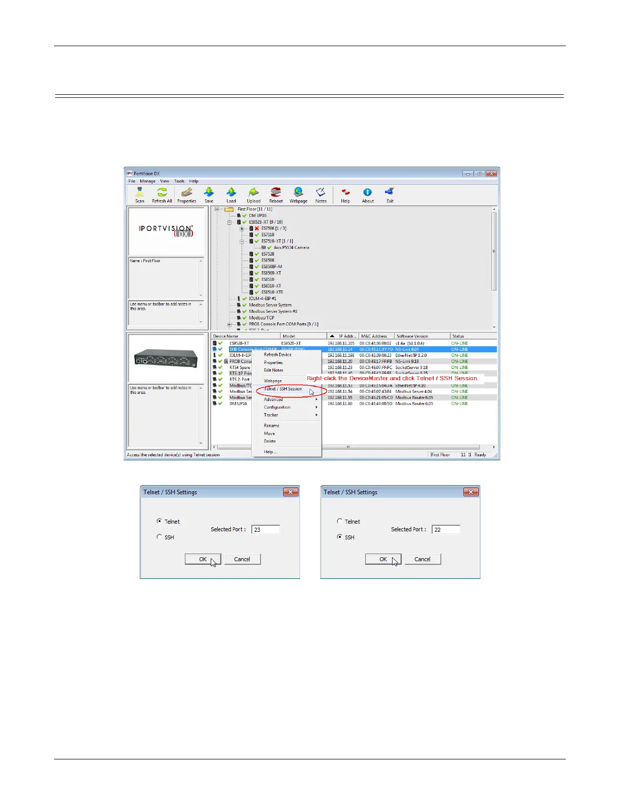 2. Select Telnet or SSH, leave the Selected Port number, and click Ok.