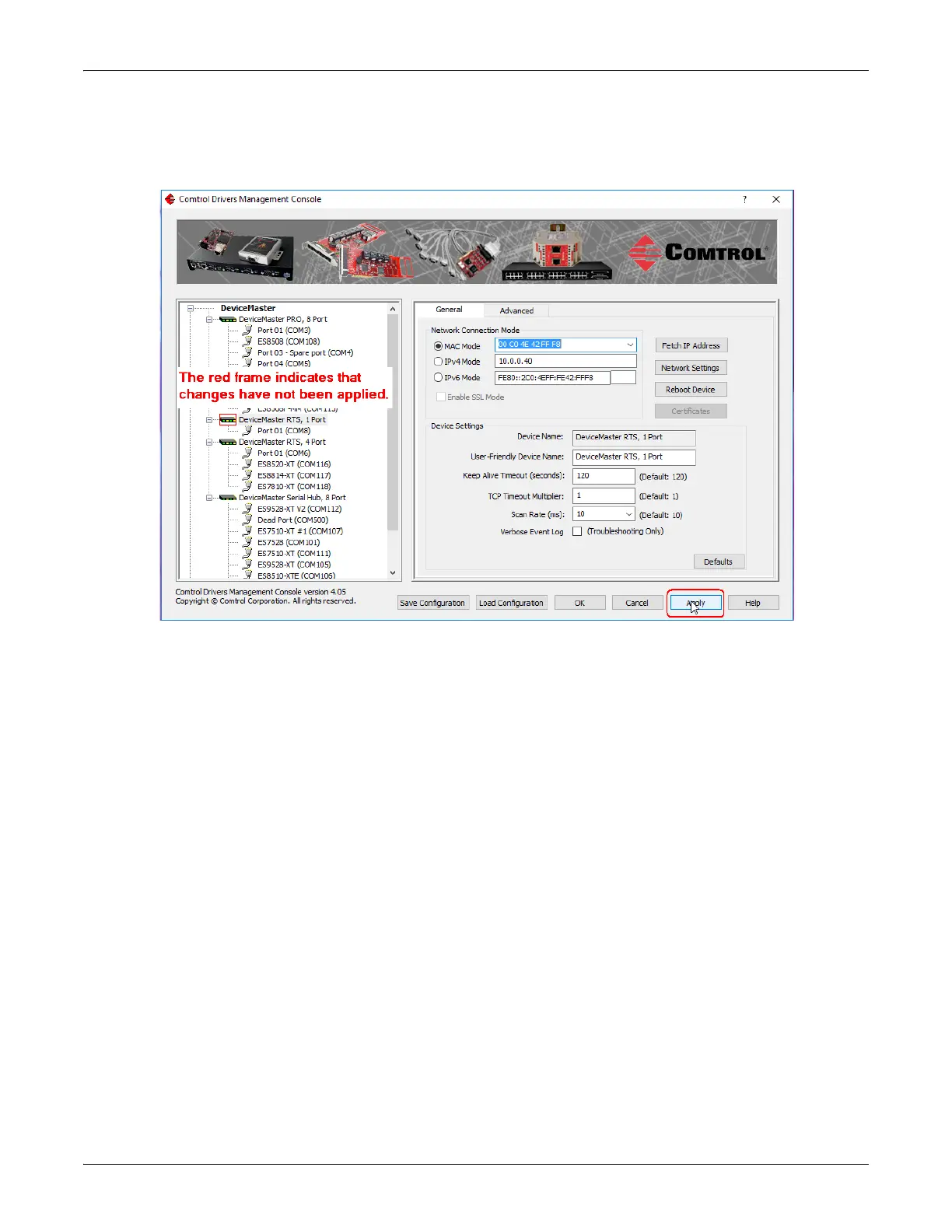 4. Click Apply to program the driver with the MAC address of the DeviceMaster or Ok to save the change
