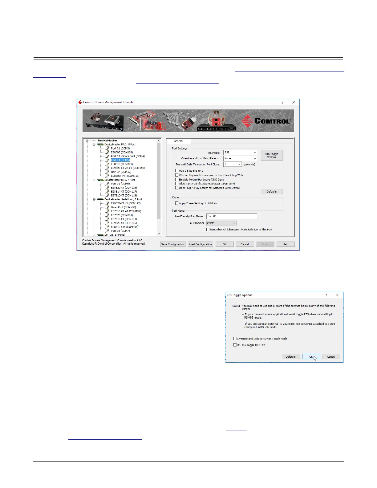 The following is a COM port properties configuration overview. Use the DeviceMaster Device Driver (NS-Link)